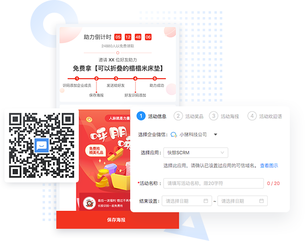 通过有吸引力的奖品,邀请多个好友助力(即好友添加企业成员),达到目标人数后可免费获得,以此诱导用户在自己的社交圈进行传播,一传二、二传四的模式,指数级增长。主要应用在各类产品促销、新品推广、课程销售等场景,获得大范围活动转发、引爆传播。