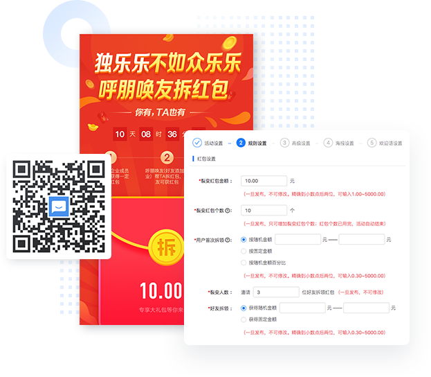 当用户拆裂变红包时,会获得首拆红包金额,并立刻入账至用户的微信零钱里,此时在规定时间内,分享给好友帮拆(好友添加企业成员),好友可获得金额不等的红包作为奖励,即刻到账。当凑齐了相应的好友人数,用户可以获得剩下的红包。用红包做活动,一直都是商家吸客的最粗暴,最直接及最有效的用户增长手段。