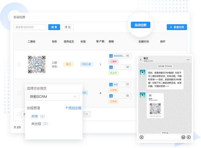 一个渠道活码对应单/多成员(相当于客服)。当客户扫码后先添加指定的客服人员,同时收到入群引导语,含入群二维码,然后扫码进群。群满后,下次扫码再推送第二群的入群码,依次往后进行,完全实现不需要员工手工拉客户进群,而且完全打破企业微信官方只能选择5个社群的局限,帮助社群高效实现拉新促活。适用于电商、母婴、教育等知识付费行业。