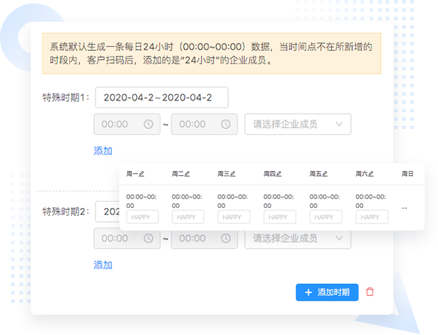 支持一码多人,且增加了排班概念。管理员可以设置企业成员的排班方式,固定周几和固定一个特殊时期内的组合,且可细分到每日的各个时段的排班。