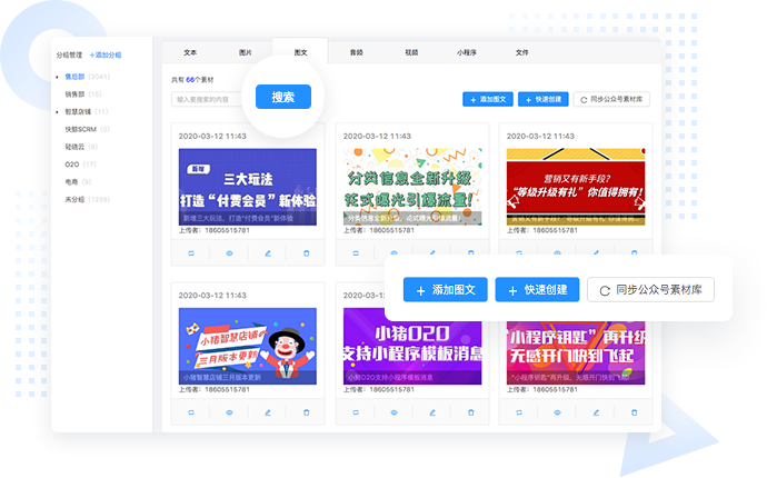 建立企业统一标准的文本销售话术,使得员工回复更加专业化。同时,还支持图片、图文、音频、视频、小程序以及文件等多种素材内容,可按产品、按行业、按业务需求或按部门等,对内容进行分类存储管理(支持多级分类),查找查看轻松便利,助力企业私域运营,变成运维高手。