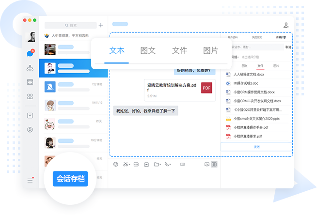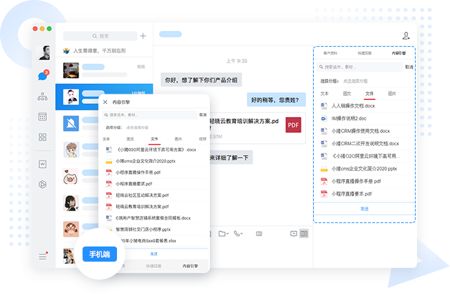 可配置内容引擎应用页面和客户详情页到聊天侧边栏。前者,方便成员在外部会话中查看相关的内容(支持多种消息格式,包括文本、图片、视频、文件以及图文),并支持一键发送,提高客户服务效率。而后者,方便成员查看并完善客户资料、查看互动轨迹、打标签及记录跟进情况,提高工作效率。