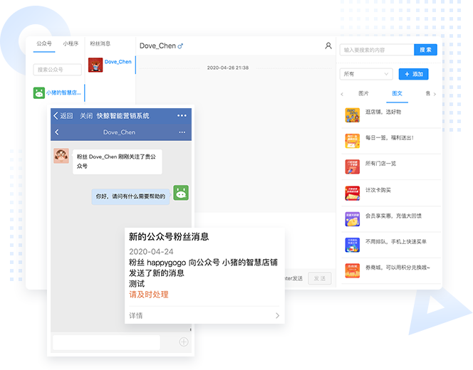 专为公众号营销与粉丝管理量身打造,利用公众号各项推送能力和客服系统,快速触达粉丝,提升粉丝活跃度,帮帮助企业高效率、低成本的获得精准目标用户,从而高效完成直接的销售转化