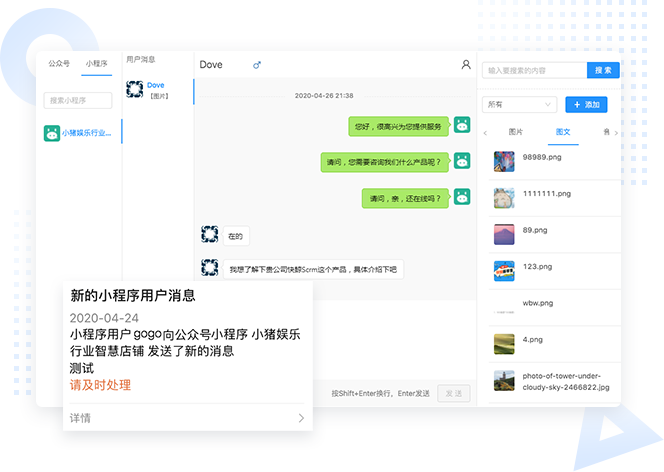 【客服中心】实现小程序同时管理,客户一对一沟通。另外,也可以通过【消息转发】功能,实现小程序用户发送给小程序客服的消息,及时通过企业微信触达到指定的客服,客服无需打开小程序后台,在企业微信里,直接对小程序用户完成实时对话。