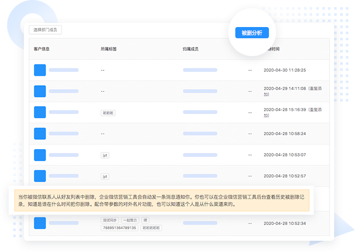 当企业微信成员被微信联系人从通讯录删除后,你将立即收到一条通知提醒。帮助你及时了解客户流失情况,优化话术。