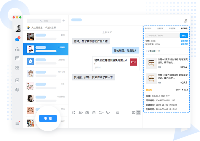 打通有赞等多电商平台,助力商家打造智慧新零售。可支持订单绑定客户,绑定后,方便员工在与客户聊天侧边栏中查看到该客户的历史订单记录与会员信息情况,并可通过关联订单为客户发送红包,还可以把商品页面,一键发送给客户,帮助商户在企业微信里形成服务闭环,提升复购率。目前淘宝正在打通中。